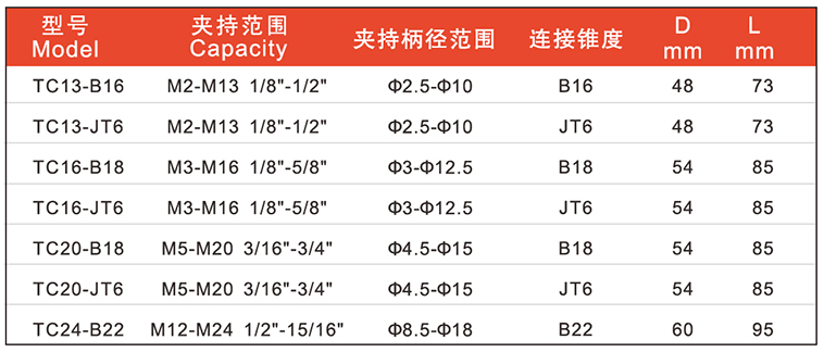 產(chǎn)品性能: 產(chǎn)品具有夾持范圍可調(diào),夾持范圍內(nèi)的英制、美制、公制及特殊尺寸的非標絲錐都可使用;本品整體使用優(yōu)質(zhì)材料,經(jīng)整體淬火,具有高精度,強扭力,高耐用等特色. 適用范圍: 常用于"西湖牌"等臺式攻絲機以及氣動、電動等各類攻絲機,并可用于車床、銑床、CNC等剛性攻絲. |